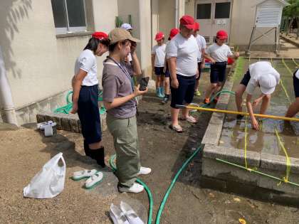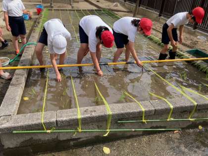 等間隔に苗を植えるためにビニルテープと高跳びのバーを使うところが小学校の米作りらしいですね。