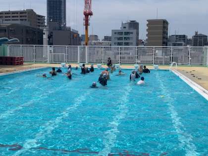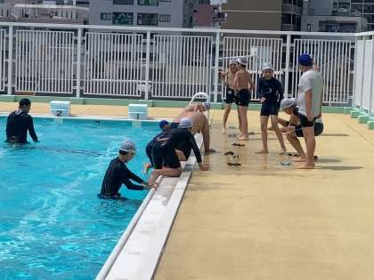 高学年は水慣れもそこそこに、初日から25mのコースでけのびやクロールに取り組んでいました。