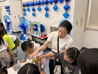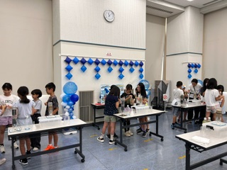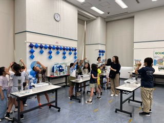 浄水場で使用しているのと同じ砂で砂濾過の実験をしています。