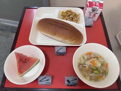 【黒糖パン、牛乳、チキンパエリア、ウインナーとキャベツのスープ、すいか】