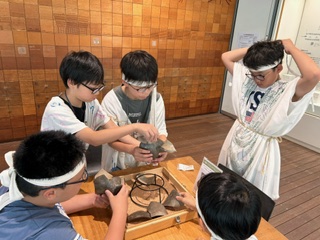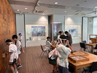 勾玉作りが終わった子から、弥生人に変身して、館内を見学しています。