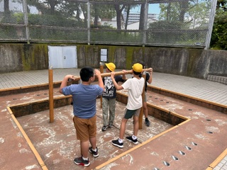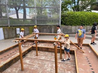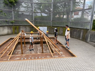 まずは、皆で竪穴住居づくり体験をしています