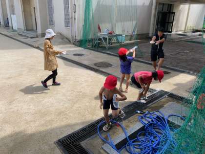 先週、天気が悪く実施できなかった水遊びを行っていました。