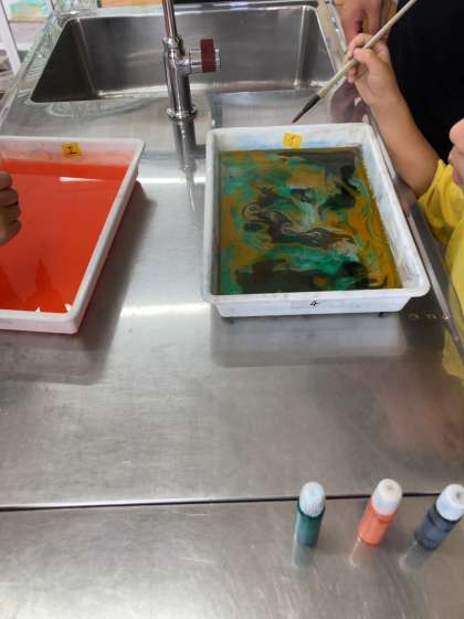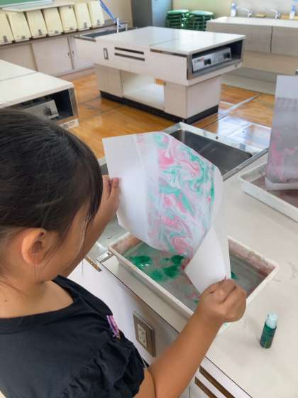 マーブリング用のインクを水に落とし、偶然できる模様を楽しんでいました。