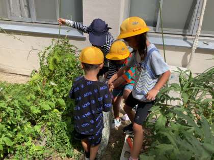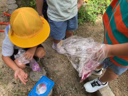 アサガオの花をつんだり、バッタ探しをしたりした後、雑草を抜いて、集めていました。