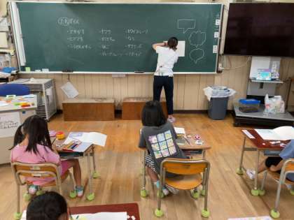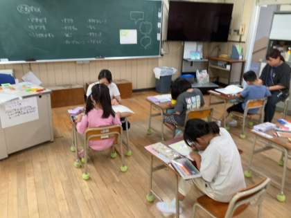今日はみんな一緒にあさがおのたねについての説明を書いていました。見た目やにおい、育て方などを書いていっていました。