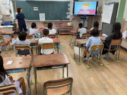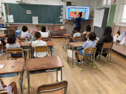 4年生にもなると英語でのやり取りスムーズになってきます。動画の合間に天気や今日の日付の確認をおこなっていました。