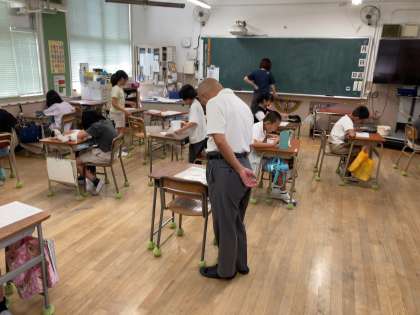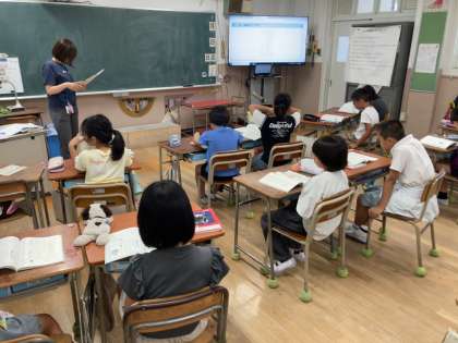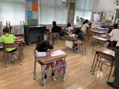 国語の教科書を見ながら授業内容の復習をした後、テストを行っていました。