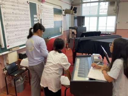 音階を教科書に書き写したり、友だちに弾き方の相談をしたり自分で考えながら練習に取り組む様子が見られました。