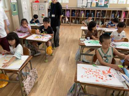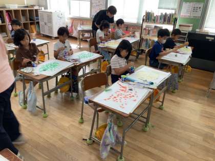 絵の具の色を2色決め、タンポを使ってポンポンしていました。