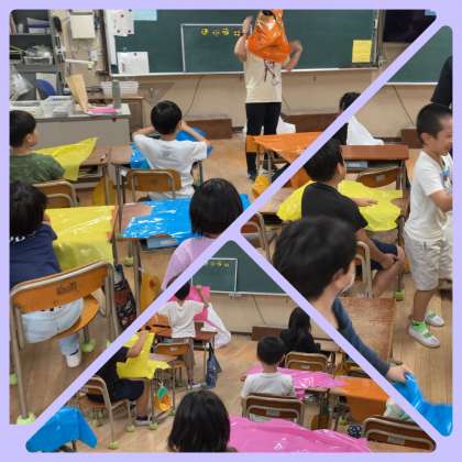 担任の先生がカラービニル袋かぶっていますが、何を作っているのでしょうか。