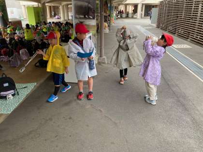 ?雨がパラパラ降ってきたのでカッパを着て見学に行きます。