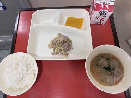 【ごはん、牛乳、豚肉と野菜のいためもの、いわしのつみれ汁、かぼちゃういろう】