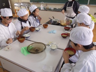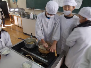 今日は、ご飯とみそ汁を作りました。なべでご飯を炊くことに挑戦しました。火加減がむずかしいようでした。少しおこげができ、おいしそうなにおいがしていました。