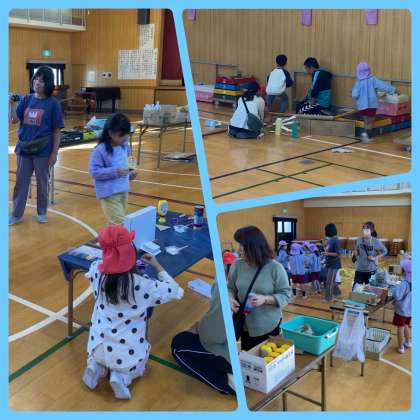1年生と東小橋保育所、東小橋幼稚園、キッズファースト保育園の5歳児さんが集まり秋あそびをしました。