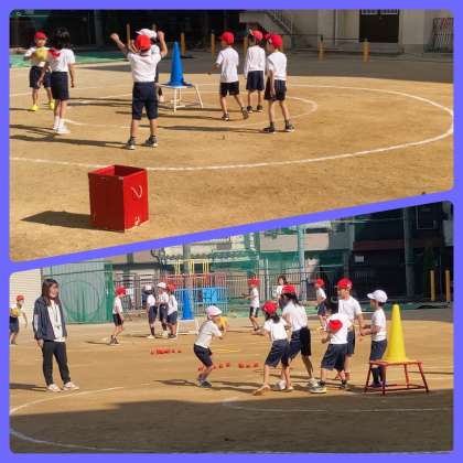 ボール投げ遊びでチームに別れ、コーンにボールを当てるゲームをしていました。