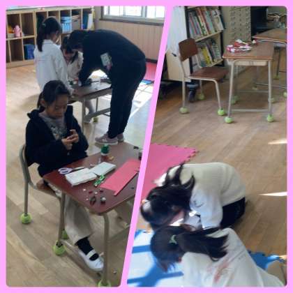 取っておいたアサガオのツルを使ってクリスマスのリースとまつぼっくりを使ったクリスマスツリー作りをしていました。