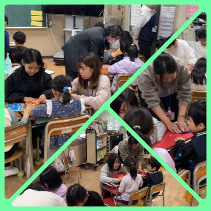 6年生の総合的な学習の時間に取り組んでいる平和学習で1年生と2年生に折り鶴を教えにきていました。