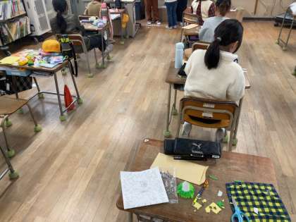 円錐にモールや飾りをつけていき、ちいささなクリスマスツリーを制作しています。