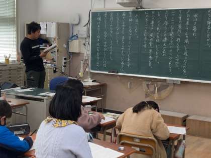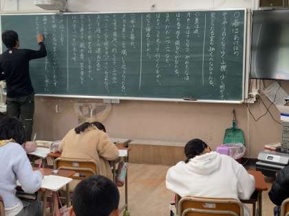 「冬はつとめて。」まで書くと結構な文章の量になりますが、みんながんばって書いていました。先生も黒板いっぱいに書いていますね。