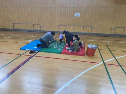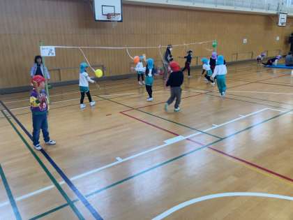 1年生は、東小橋幼稚園、東小橋保育所、キッズファースト保育所と合同で昔遊びを行いました。それぞれのブースでコマやかるた、はねつきといろいろな遊びを体験しました。