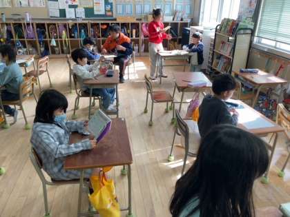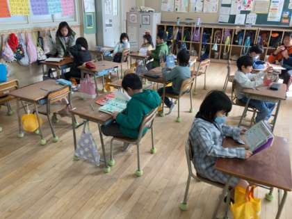 担任の坂井先生に聞くとこの時間は漢字テストに始まり暗唱のテストを3つやってその後国語のテストがあり、今は漢字の書き順テスト中とのことでした。