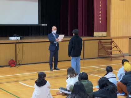 校長先生から6年生が表賞状を授与されています。3学期に入ってさまざまな分野の表彰が続いているのは嬉しいかぎりです。