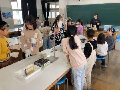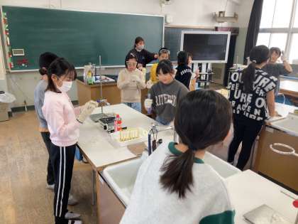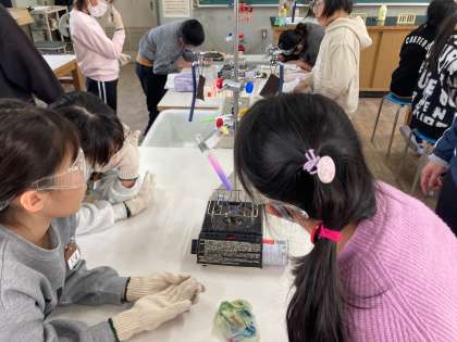 「水のあたたまり方」の実験をしていました。試験管に示温インクで色づけした水を入れて底からあたためています。