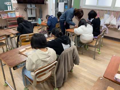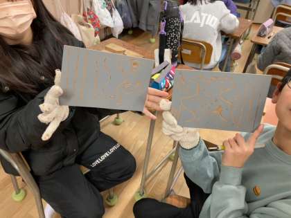 初めての彫刻刀ということで今日は本番より小さい板を使い彫り方の練習をしていました。
