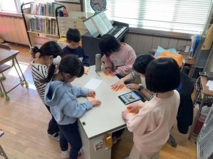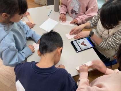 折り紙でおすもうさんを作るためにみんなで折り方の動画を見ています。