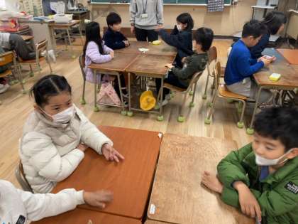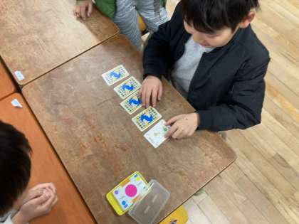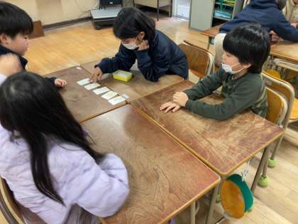 分数トランプを使って大きさ比べをしていました。単純な遊びですが、同じ大きさの分数が見つかったり大きさが近い分数があるとどうやって比べたらいいか考えたりといろいろな発見があります。