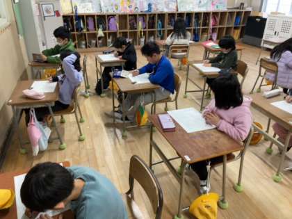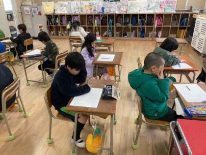 国語のテストをやっていました。これが2年生最後の国語テストになりました。1年間でたくさんのことを学びたくさんのテストをしましたね。