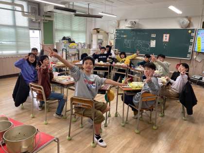 今日が小学校で食べる最後の給食となりました。最後は円になって食べるようで、配膳が完了したらみんなでポーズを取ってくれました。