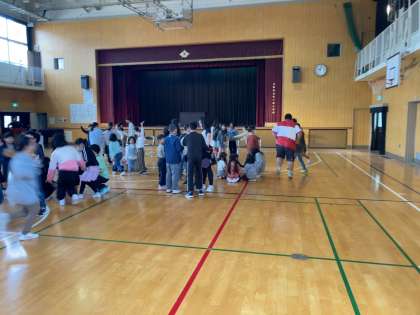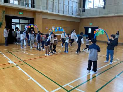 次に全校児童で「もうじゅうがり」をして楽しみました。はじめは少し緊張気味の1年生でしたがゲームが終わるころには笑顔が溢れていました。