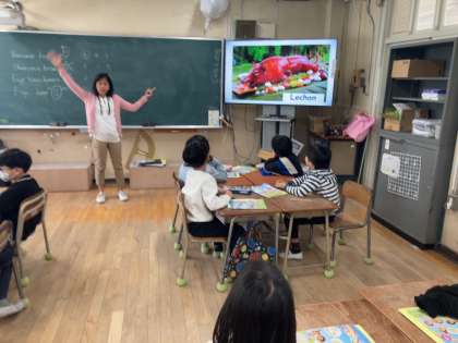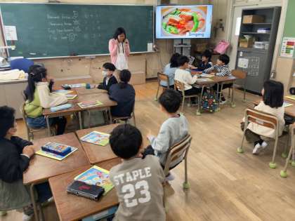 3年生から新しく始まった外国語活動のはじめての授業です。C-NETの先生は昨年も東小橋小学校に来ていただいていたミシェル先生です。