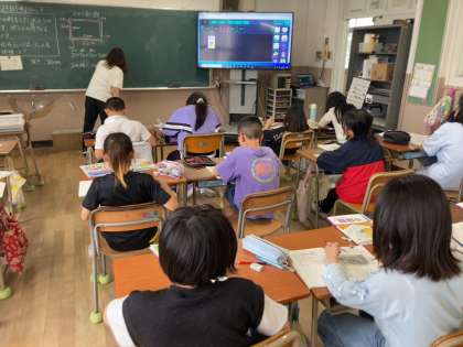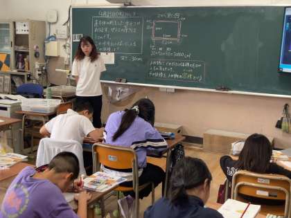 「体積」の単元の学習で、今日は容積について考えています。中にためる水の容積を測るにはどこの長さを考える必要があるか意見を出し合っていました。
