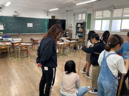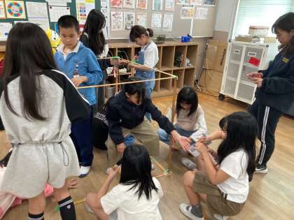 「体積」の学習で大きな体積の単位「立方メートル」を学び、1立方メートルを実際に作っている様子です。1メートルのものさしを組み合わせ、みんなで協力して作っていました。