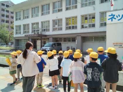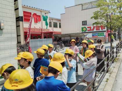 校区内を歩き、どんな建物やお店があるのか確認しています。5月にはあべのハルカスに社会見学に行き、大阪市内にはどんな建物があるのか調べに行きます。曇ったり雨になったりすると遠くまで見れなくなるので当日は天気が良くなることを祈っています。