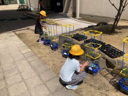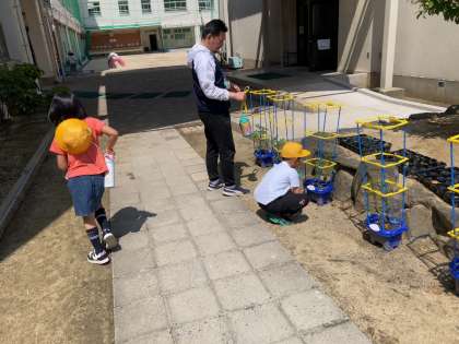 植木鉢のミニトマトや学習園の野菜に水をあげた後、サツマイモの苗が明日届くのに備えて畝を作っていたようです。