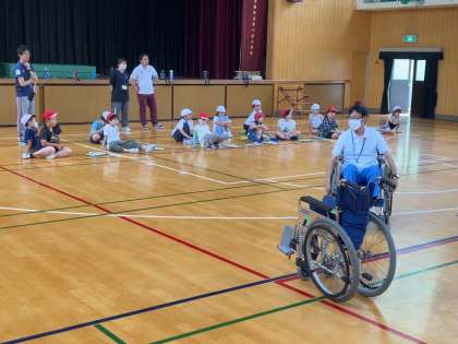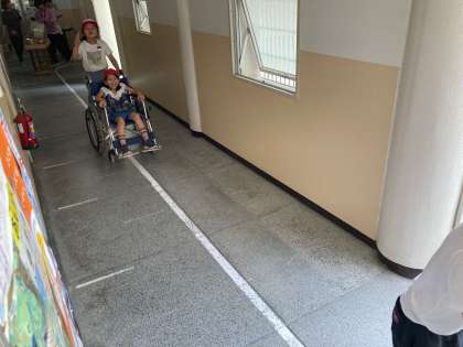 車いす体験をしていました。講堂で車いすの基本的なことを学習したあと、ペアになって校舎内を車いすで回っていました。ちょっとよそ見をすると前のグループにぶつかりかけたり道を外れかけたりと操作するほうも押してあげるほうもなかなか難しそうでしたが、楽しく取り組んでいる様子が見られました。