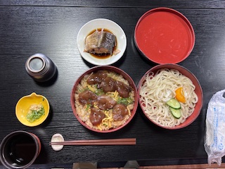 手ごね寿司とうどんに朝釣った魚の煮付けが付いています。