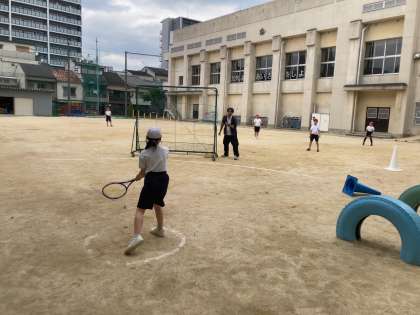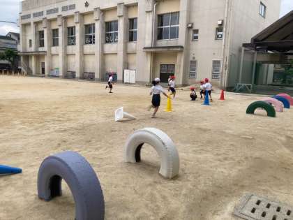 テニスラケットを使ったベースボール型のゲームに取り組んでいました。ラケットを使うとボールが打ちやすくなるのでみんな楽しそうにやっていました。ボールを取ったところに守備が集まって座るまでに通ったコーンの色で点数が入るので点数がたくさん入るのもおもしろい要素になっています。