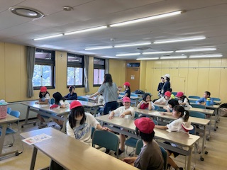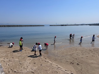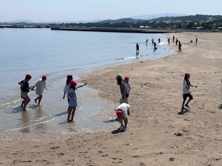 簡単な説明を聞いた後、海岸で貝殻を拾っています。