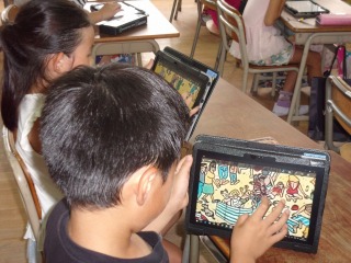 また、「ピンチイン」「ピンチアウト」の仕方を教わったあとは、「ウォーリーをさがせ」で楽しみました。