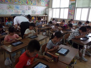 教育センターの方にゲストティーチャーとして来て頂き、学級で初めてタブレットにさわりました。電源の入れ方や切り方、「タップ」「ダブルタップ」の仕方などを教わりました。