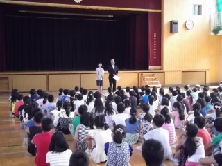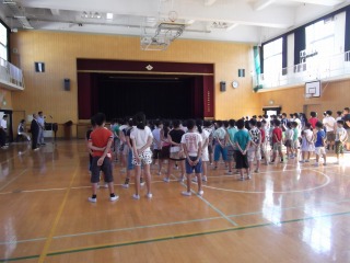 まず、大阪市歌を歌い、次に校長先生から1学期の話と夏休みについての話がありました。