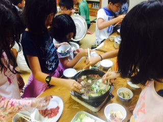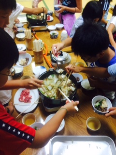 夕食のすき焼きを食べています。たくさん歩いて運動し、ゆっくりお風呂にも入ったので、お腹がぺこぺこだったようです。美味しくいただいています!