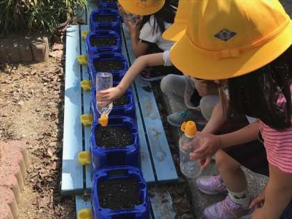 前の時間には、種の絵を描いて、出てくる芽の葉の形はどんな形か、予想しました。丸?三角?ハート?とがってる形?いろんな予想が出ました。子どもたちは、「芽がでるかなぁ。」「おおきくなってね。」と願いながら、大事そうに種をまきました。