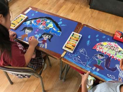 国語の教科書にのっている「わたしのかさはそらのいろ」を読んで、「私だったら、傘をさしたら、こんな世界にいける傘がほしいな!」「ぼくの傘には、友達と動物も入って、楽しそうにしてるよ!」と想像を広げながら、夢中で描きました。