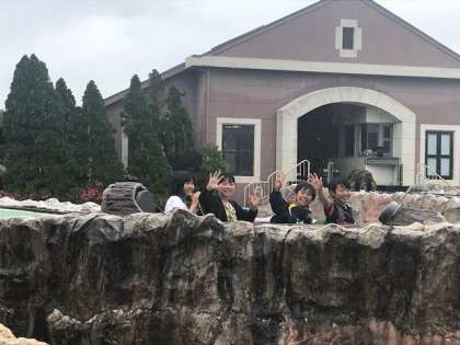 雨が降っていますが、みんな元気です。グループ活動をしています!